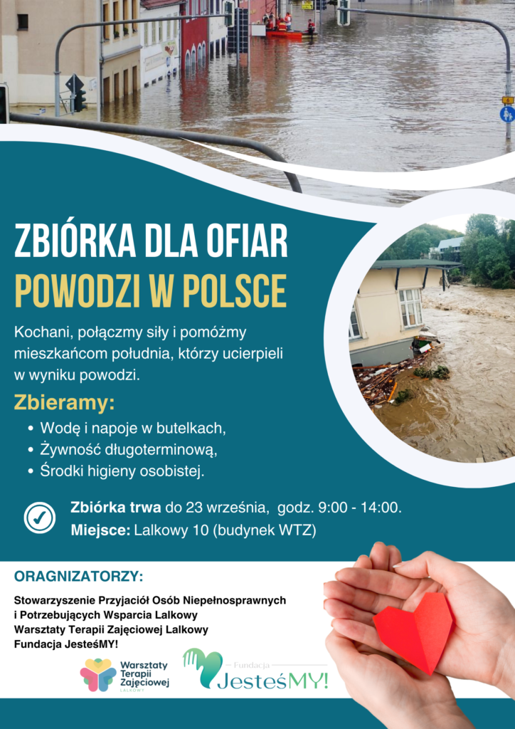 Wspólnie z Fundacją JesteśMY! organizujemy zbiórkę dla osób, które w wyniku powodzi utraciły dorobek życia.
